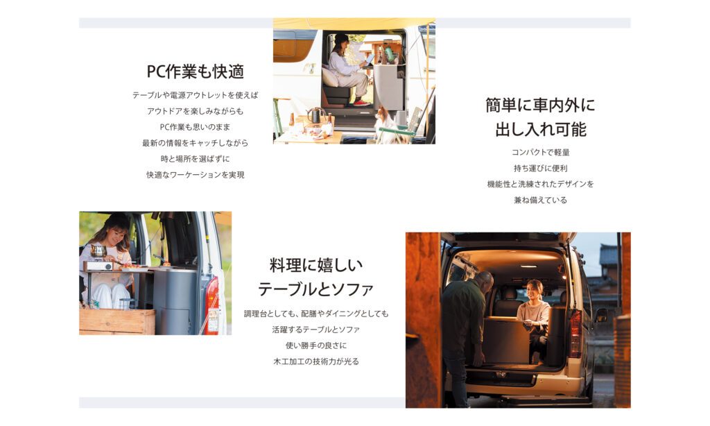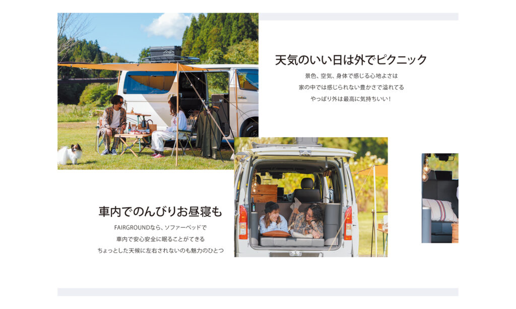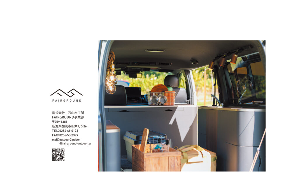 加茂市で施設什器などを手がける木工メーカー・石山木工所。同社が展開するDIYキット FAIRGROUND(フェアグランド) のパンフレットを制作しました。 このキットは、普段使いの家具がそのままキャンピングカーの家具として活用できるユニークな商品。その魅力を、わかりやすく、シンプルに伝えることを心がけました。