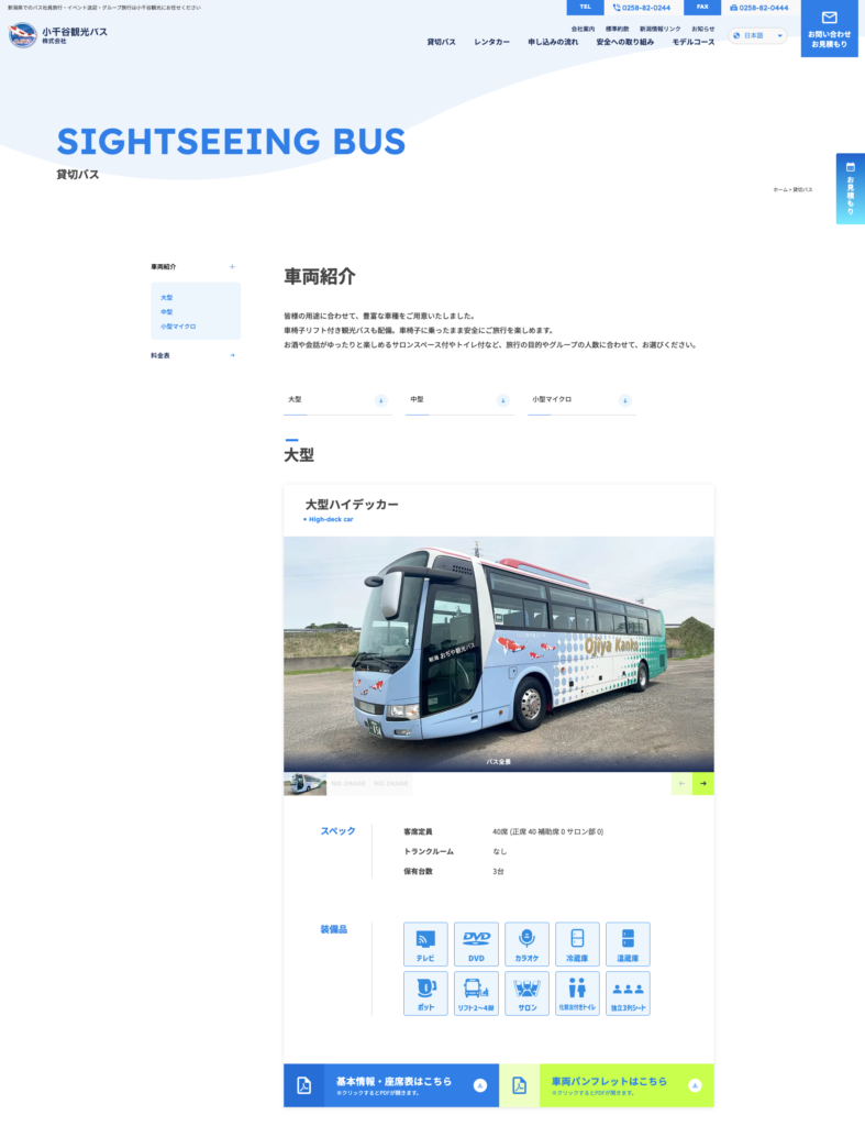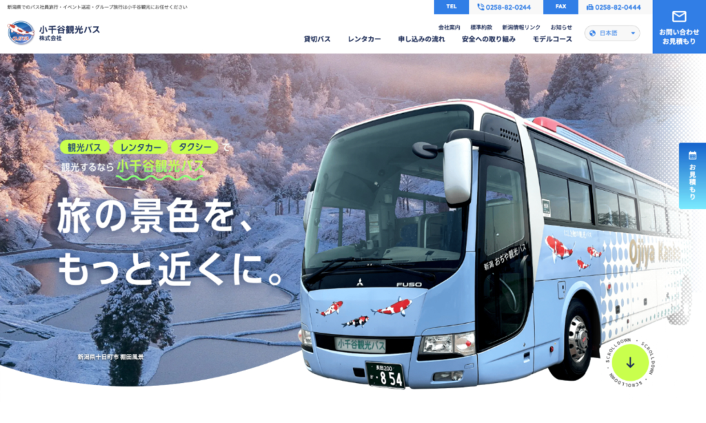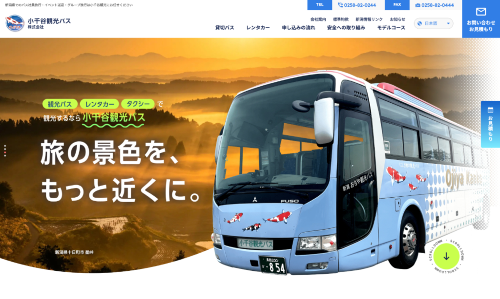 新潟県小千谷市を拠点に、貸切バスやレンタカーサービスを展開する小千谷観光バス株式会社様の公式サイトをリニューアルしました。地域に根ざしたバス会社としての安心感を大切にしながら、「旅の楽しさ」や「人のあたたかさ」が伝わるデザインを目指しています。また、貸切バスならではの「プライベート空間」と「自由な行程」をの良さサイトを見た方に存分に伝える作りになっています。