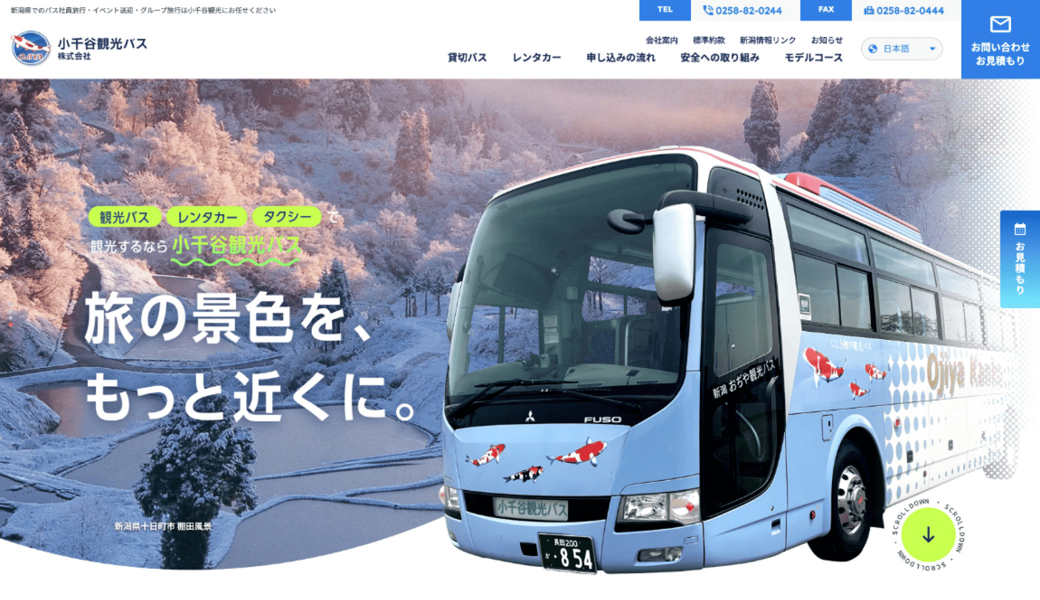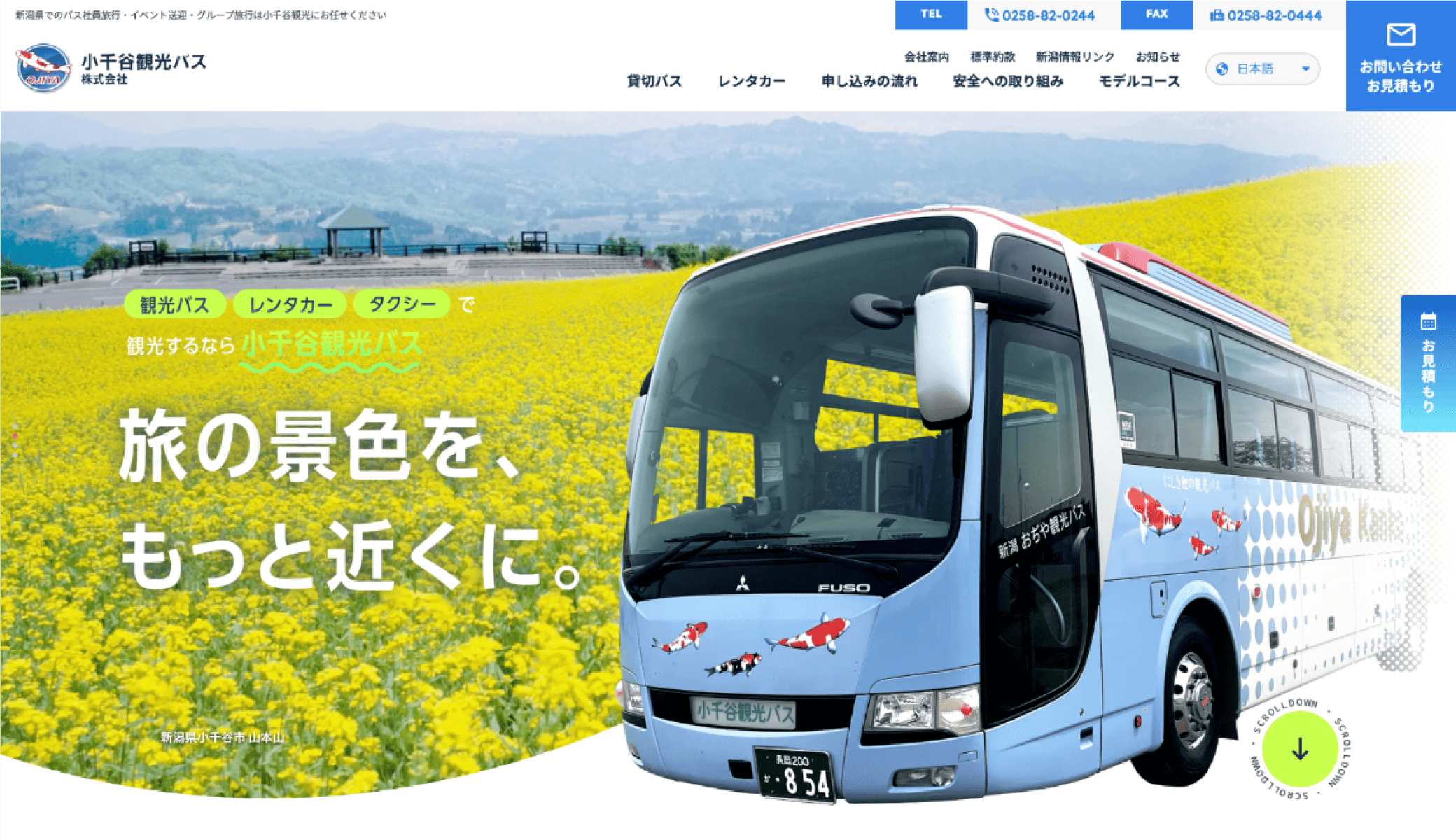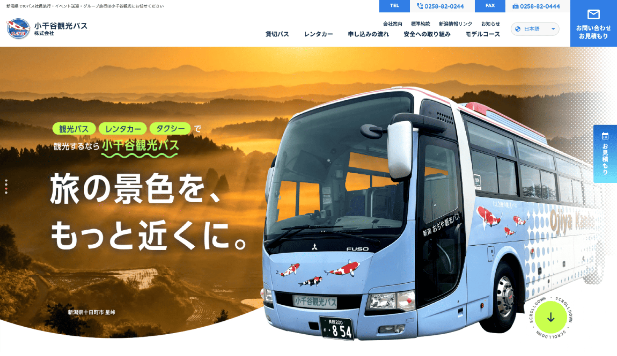 新潟県小千谷市を拠点に、貸切バスやレンタカーサービスを展開する小千谷観光バス株式会社様の公式サイトをリニューアルしました。地域に根ざしたバス会社としての安心感を大切にしながら、「旅の楽しさ」や「人のあたたかさ」が伝わるデザインを目指しています。また、貸切バスならではの「プライベート空間」と「自由な行程」をの良さサイトを見た方に存分に伝える作りになっています。